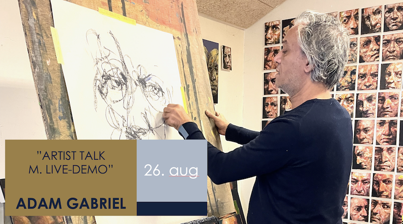 Billedkunstneren Adam Gabriel fortæller om sin kunst, om nogle af de aktuelt udstillede værker og demonstrerer sin tilgang til portrætterne
